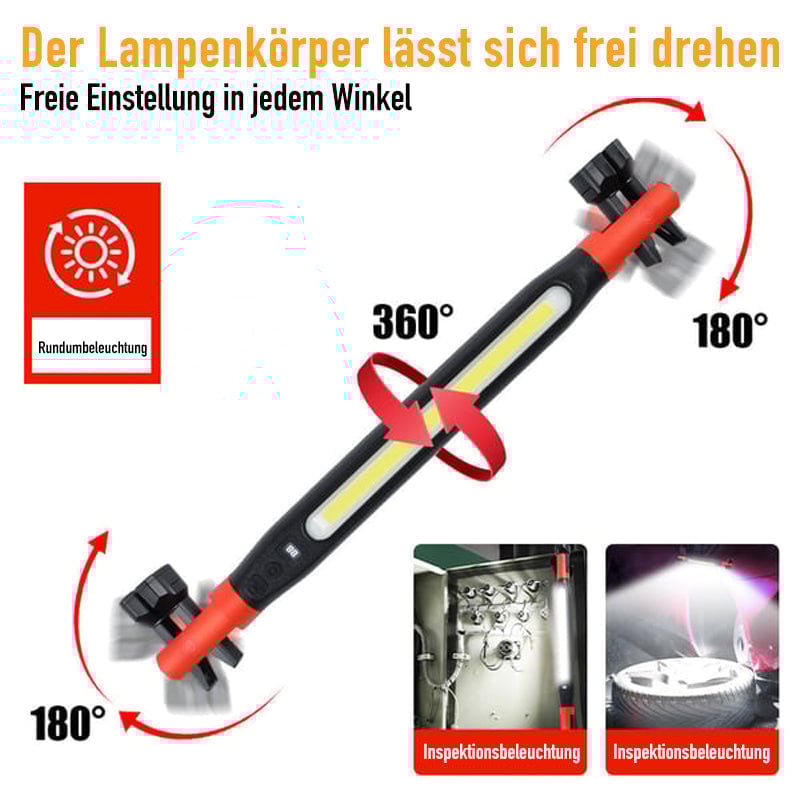 Der Lampenkörper lässt sich frei drehen und ermöglicht eine vollständige Rundumbeleuchtung (360°/180°). So wird jeder Winkel optimal ausgeleuchtet – ideal für Reifenreparaturen, Unterbodeninspektionen oder Werkstatteinsätze.
