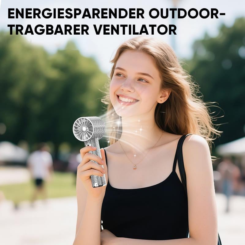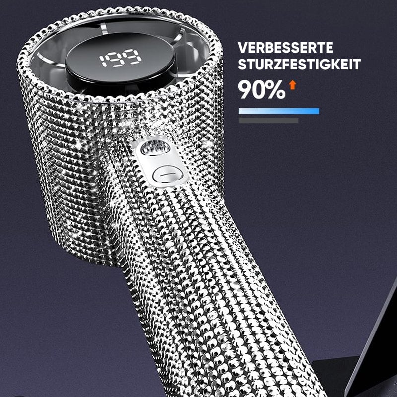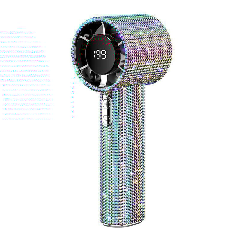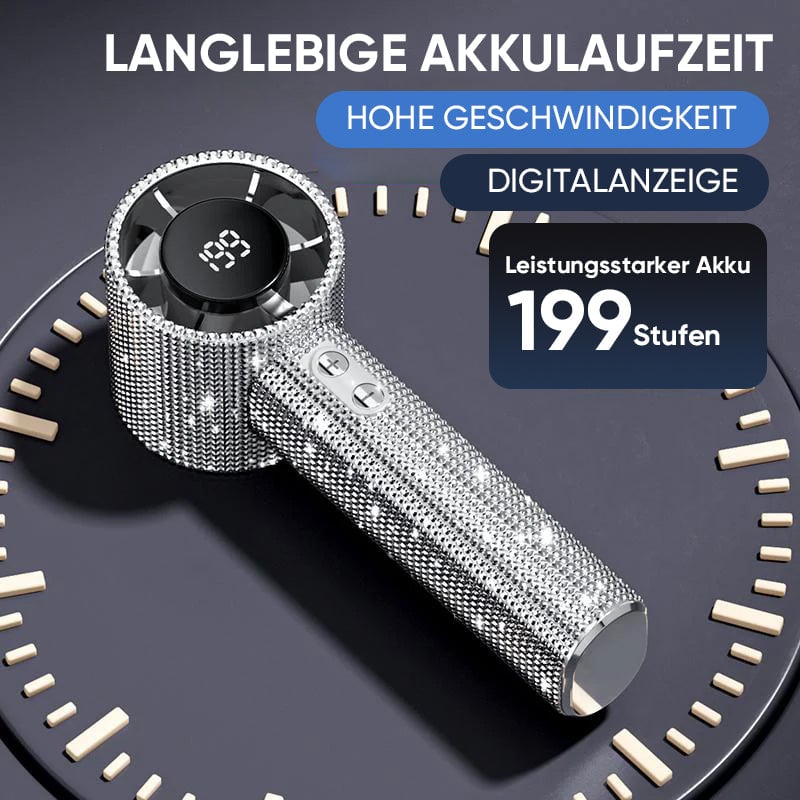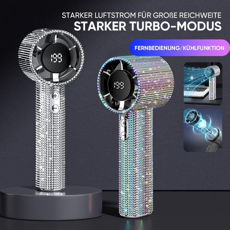Faszinierendes Kristalldesign, bedeckt mit funkelnden Strasssteinen und einer luxuriösen Metalloberfläche, lässt dieser Mini-Ventilator in jedem Licht erstrahlen. Die schlanke zylindrische Form bietet einen bequemen Griff, während das stilvolle Aussehen ihn zu einem perfekten Accessoire macht, das Ihr Sommeroutfit oder Ihre glamourösen Abendlook ergänzt.