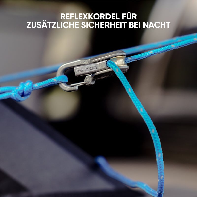 Mit einem Seil-Cam müssen Sie einen Befestigungs-Knoten nur einmal binden. Führen Sie ein Ende Ihres Zubehörseils durch den Hering oder die Öse und binden Sie eine 5 cm große Schlaufe an das Ende. Stecken Sie dann das andere Ende durch die Schlaufe und ziehen Sie es straff. Danach clippen Sie einfach den Ropeholder an den anderen Befestigungspunkt und ziehen Ihr Zubehörseil durch den Cam. Fertig.