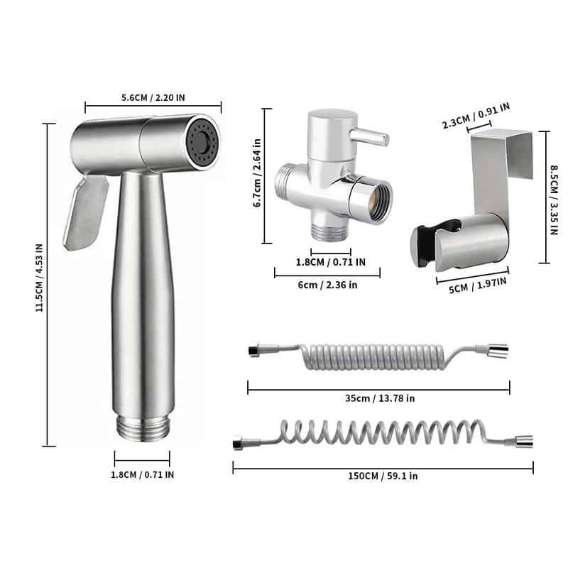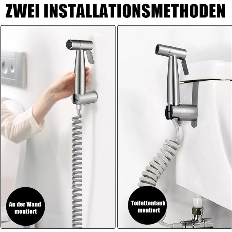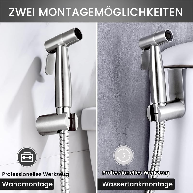 Das komplette Zubehör-Kit ist enthalten. Sie können die Duschbrause in nur zehn Minuten an der Wand oder am Toilettentank montieren – ganz einfach ohne aufwendige Werkzeuge.